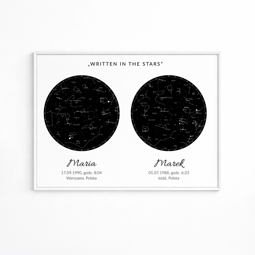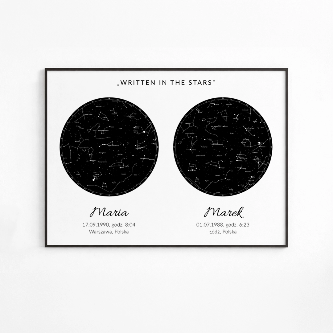 Klasyczna Mapa podwójna Nieba i Gwiazd w wydaniu podwójnym idealnie sprawdzi się dla par na rocznicę ślubu lub na wesele jako prezent dla rodziców. Mapa gwiazd w kolorystyce klasycznej czarnej idealnie wkomponuje się w każde wnętrze. Wystarczy podać swoje daty, godziny i miejsca urodzenia i zobaczcie, że rzeczywiście było Wam to zapisane w gwiazdach :).