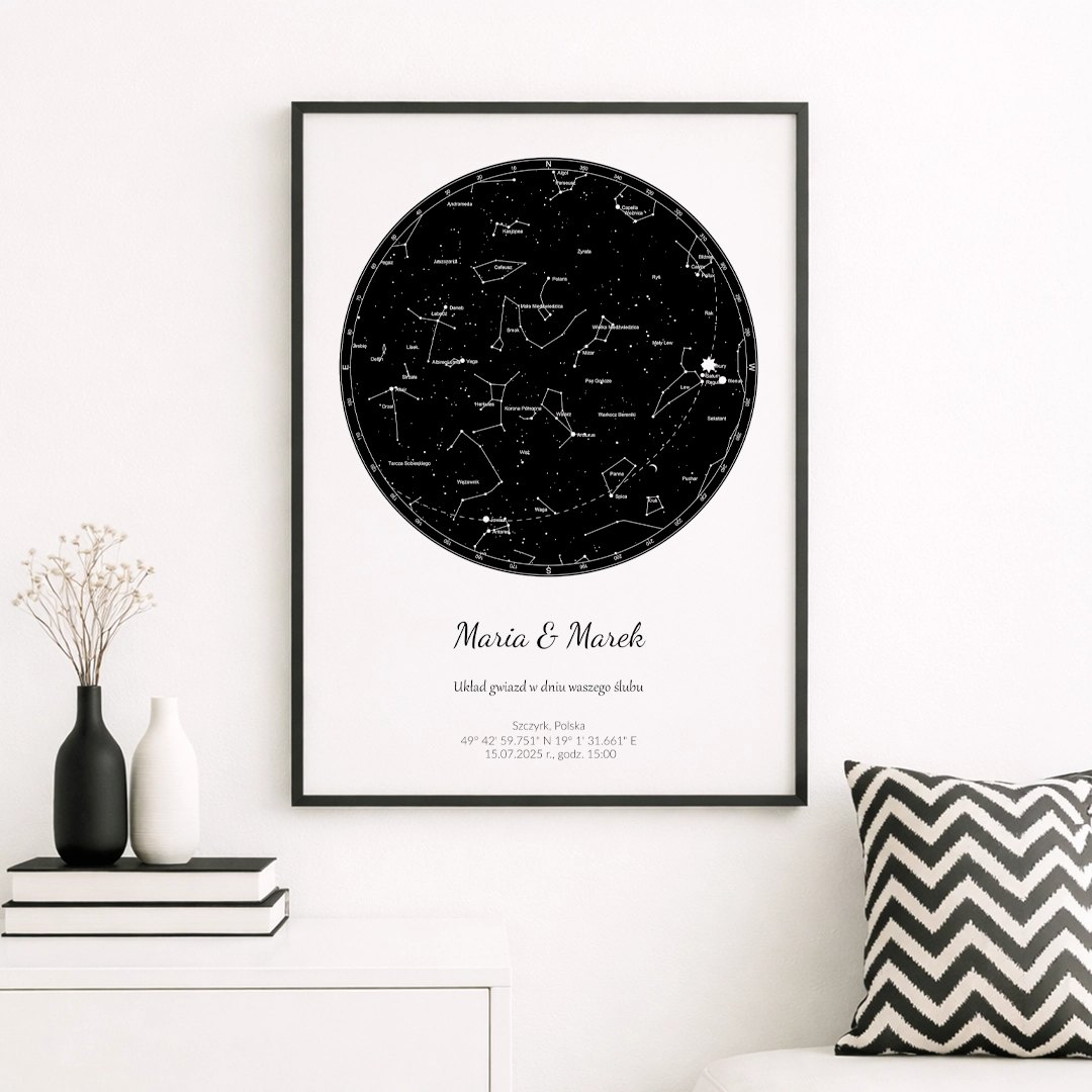 Personalizowana Mapa Nieba – to kolorystyka czarno biała – pasująca do większości nowoczesnych wnętrz. Dokładna Mapa gwiazd, które były nad Waszymi głowami w wybranym miejscu, dacie, godzinie i minucie to niepowtarzalna pamiątka wyjątkowego wydarzenia.