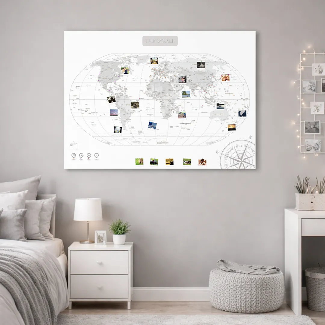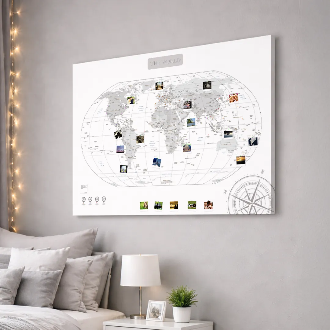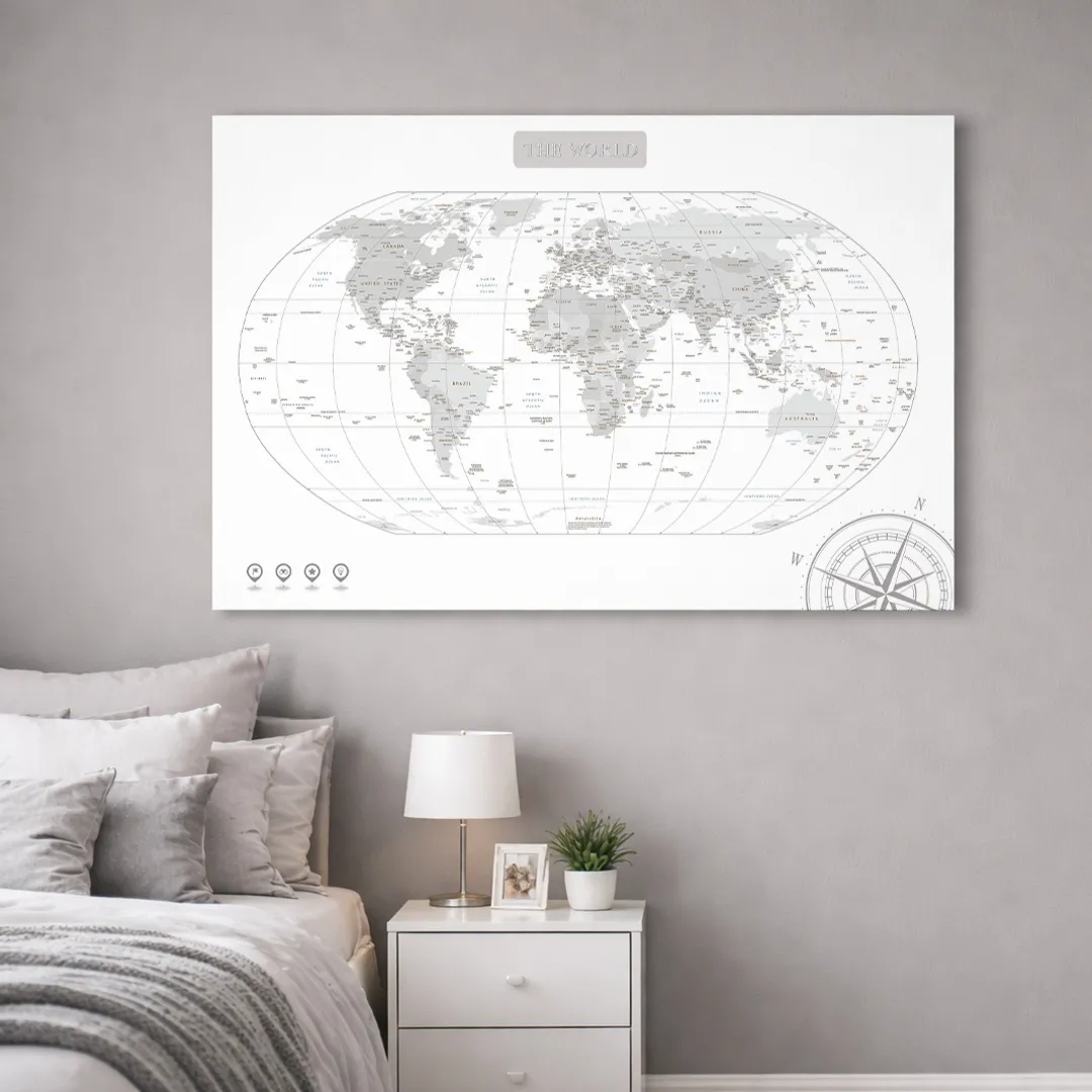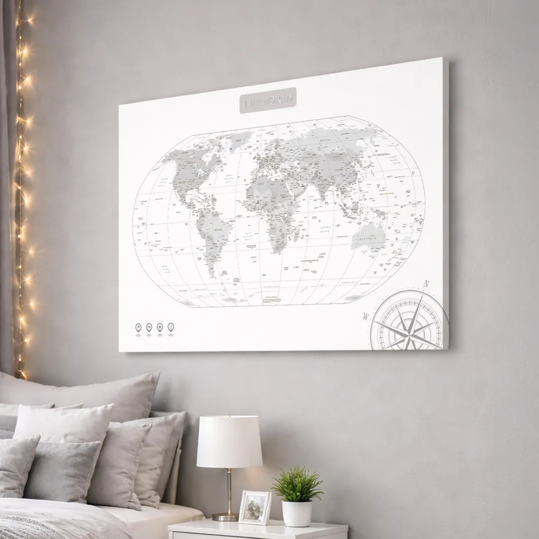 Szara Mapa Świata do zaznaczania podróży XXL będzie doskonałym prezentem dla osoby która jest prawdziwym fanem dalekich podróży, Oznaczanie podróży już zrealizowanych, zaplanowanych oraz tych wymarzonych za pomocą pinezek oraz zdjęć daje niesamowitą satysfakcję wszystkim podróżnikom